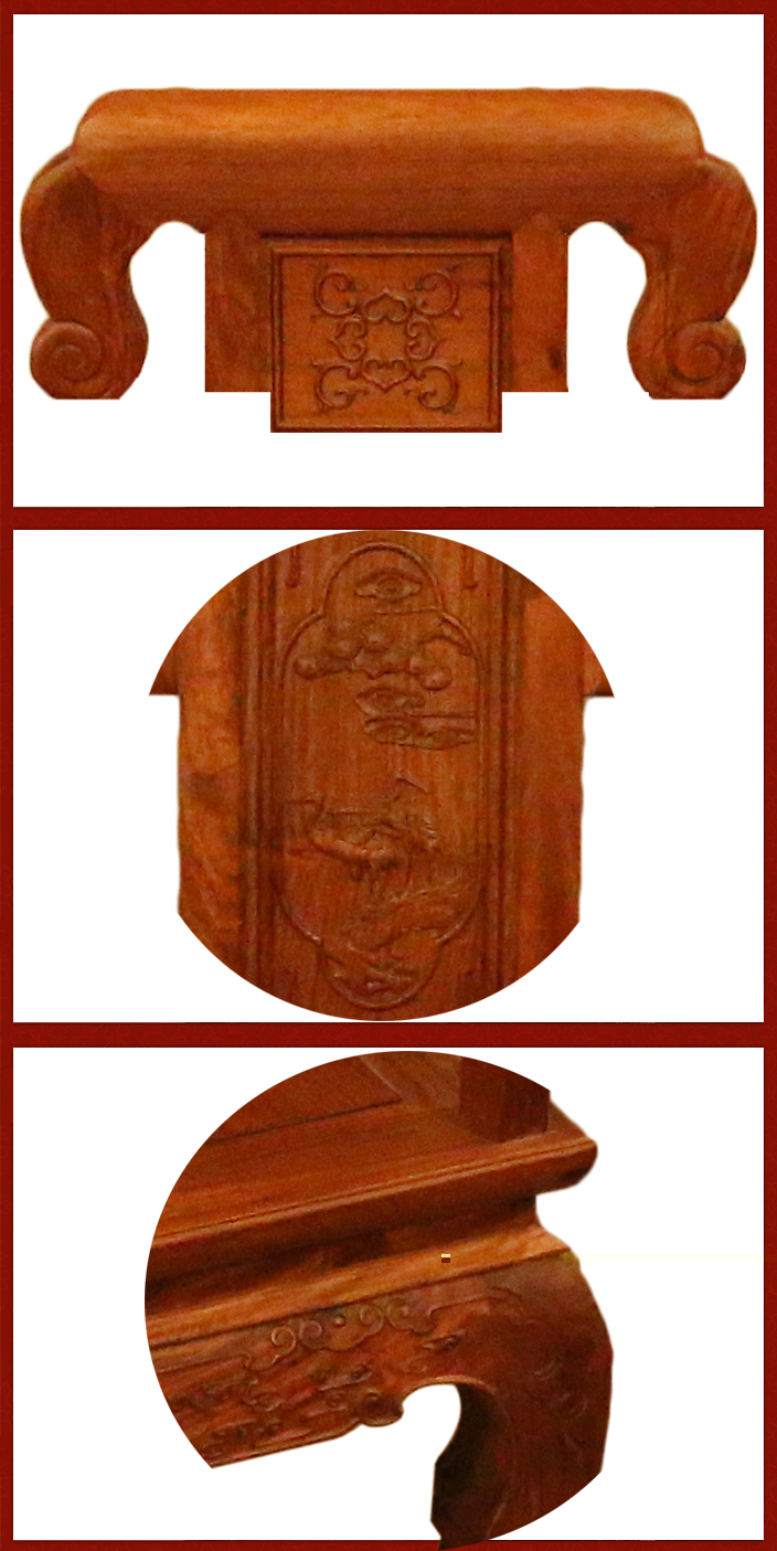 之后,是餐椅的主架骨,坐板以及四腳處,餐椅坐板平整圓潤,四處椅腳處亦呈圓滑之態(tài)向下順勢延伸,頗顯自然流和,餐椅正左右三面各有三條支板木架相接,使之更加穩(wěn)固,椅腳各處亦有多處祥云絲邊鑲嵌裝飾之上,整體裝飾上也愈更顯得和諧工整美觀。