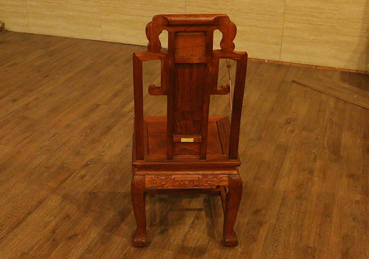 從上往下看,正面,呈直線狀的椅靠背板頂部,左右兩處各相接一尾彎角圓弧以及底部呈祥云內(nèi)環(huán)繞形態(tài)的底腳,分別駕于下處兩截木條之上,給人一種閑庭屹立之感,頗顯意味沉韻;